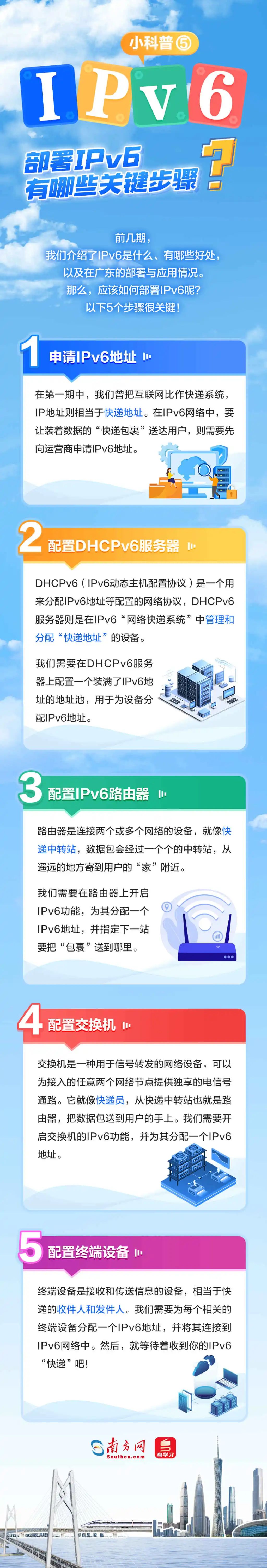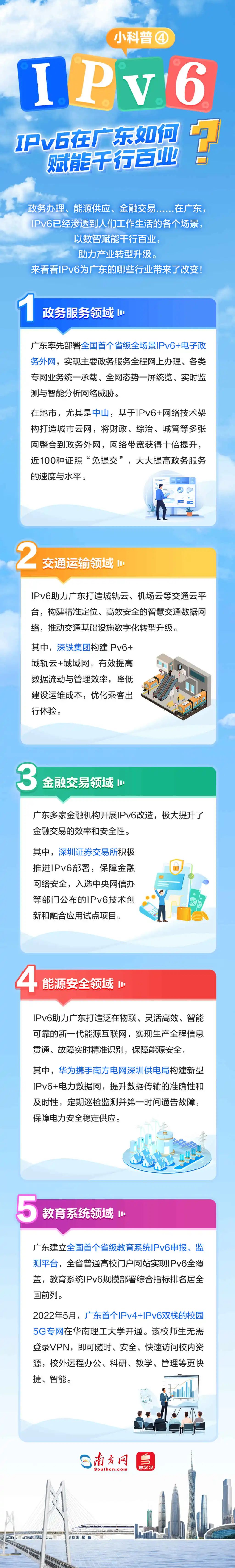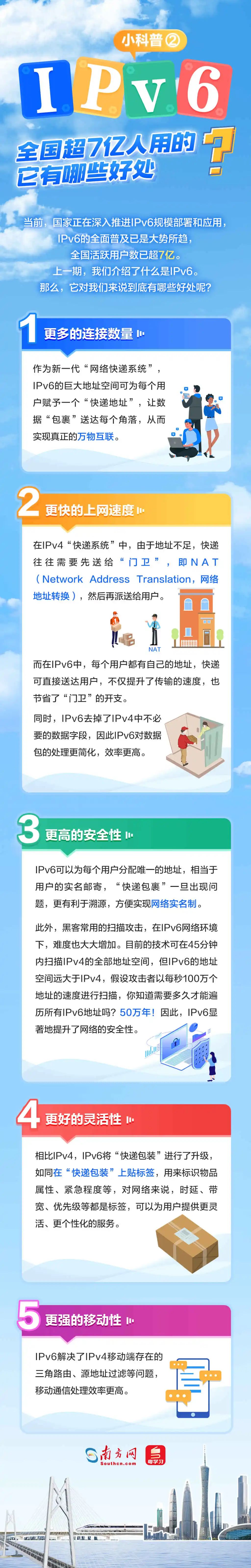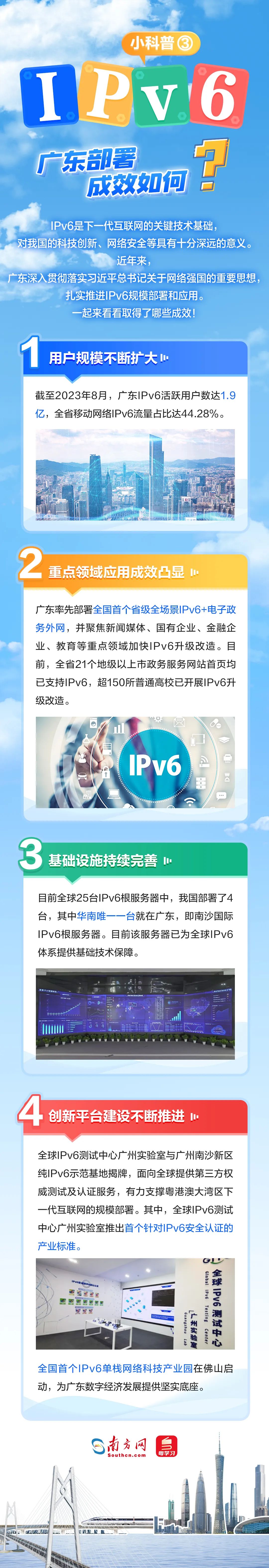 2024年是習(xí)近平總書記提出網(wǎng)絡(luò)強國戰(zhàn)略目標(biāo)10周年,也是我國全功能接入國際互聯(lián)網(wǎng)30周年。作為下一代互聯(lián)網(wǎng)的基礎(chǔ),IPv6的規(guī)模部署和應(yīng)用是網(wǎng)絡(luò)安全能力強化的迫切需要,可為網(wǎng)絡(luò)強國建設(shè)提供有力支撐。近年來,廣東IPv6規(guī)模部署取得良好效果,積極賦能千行百業(yè)加快形成新質(zhì)生產(chǎn)力。 什么是IPv6?它對我們來說有哪些好處?廣東IPv6部署取得了哪些成效,為哪些行業(yè)帶來了改變?部署IPv6又有哪些關(guān)鍵步驟?5張圖帶你看懂這個能為地球每粒沙子編地址的神奇技術(shù)!