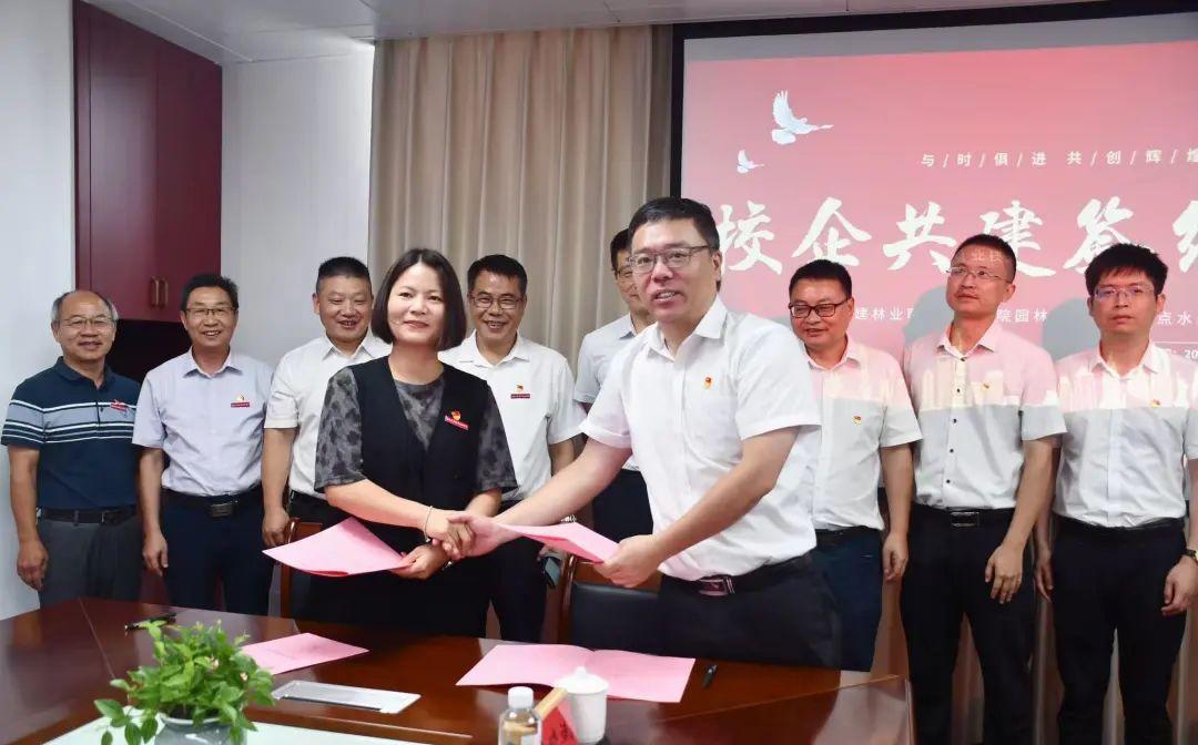 林職院園林系黨總支書記黃淑燕、系主任黃華明和山點水公司黨支部書記王志龍、總經理季恭國,分別代表福建林業職業技術學院園林系和南平市山點水園林有限公司現場正式簽署《黨建共建協議》和《校外實訓基地共建協議》。