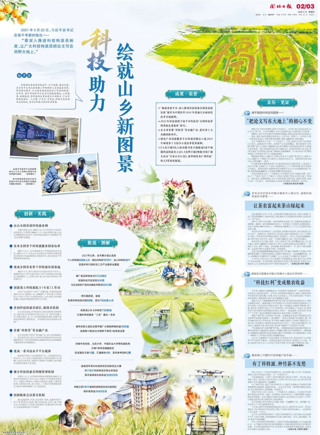 成果·榮譽(yù) 01 ★“福建省南平市:深入推進(jìn)科技特派員制度創(chuàng)新發(fā)展”被評(píng)為中國(guó)改革2024年度地方全面深化改革市域案例。 ★2022年科技部授予南平市科技局“全國(guó)科技管理系統(tǒng)先進(jìn)集體”稱號(hào)。 ★在全省首推“科特貸”等金融產(chǎn)品,獲評(píng)省十大金融創(chuàng)新項(xiàng)目。 ★綠色產(chǎn)業(yè)創(chuàng)新服務(wù)平臺(tái)的建設(shè)做法入選2024年福建省十大綜合示范改革優(yōu)秀案例。 ★《人民日?qǐng)?bào)》民主政治版刊發(fā)專題報(bào)道《南平破題科技特派員立法》,《光明日?qǐng)?bào)》整版刊發(fā)《“源頭活水”引來(lái)山鄉(xiāng)巨變》,新華網(wǎng)發(fā)布《“種科技”的人》等深度報(bào)道。 創(chuàng)新·實(shí)踐 02 ★出臺(tái)全國(guó)首部科特派條例 完善科特派立法,2025年11月公布《南平市促進(jìn)科技特派員工作條例》;2026年1月1日起《條例》實(shí)施,以法治保障制度長(zhǎng)效運(yùn)行,實(shí)現(xiàn)科特派制度從“政策推動(dòng)”到“法治保障”的跨越。 ★發(fā)布全國(guó)首個(gè)科特派服務(wù)國(guó)家標(biāo)準(zhǔn) 2021年11月,發(fā)布福建省首個(gè)科特派服務(wù)地方標(biāo)準(zhǔn),2023年11月,《農(nóng)業(yè)社會(huì)化服務(wù)科技特派員服務(wù)規(guī)范》獲國(guó)家市場(chǎng)監(jiān)督管理總局批準(zhǔn)發(fā)布,成為全國(guó)首個(gè)科特派服務(wù)國(guó)家標(biāo)準(zhǔn)。 ★建成全國(guó)首家骨干科特派培訓(xùn)基地 2022年3月,南平市政府與中國(guó)農(nóng)村技術(shù)開(kāi)發(fā)中心、福建省科技廳合作共建全國(guó)首個(gè)骨干科技特派員培訓(xùn)基地,建成建陽(yáng)仁山、武夷山燕子窠、延平溪后等30余個(gè)現(xiàn)場(chǎng)教學(xué)點(diǎn)。 ★創(chuàng)新建立科特派院士(專家)工作站 針對(duì)產(chǎn)業(yè)發(fā)展中“卡脖子”關(guān)鍵問(wèn)題,開(kāi)展科特派聯(lián)建技術(shù)攻關(guān),搭建茶產(chǎn)業(yè)、森林碳匯產(chǎn)業(yè)等28個(gè)科特派院士(專家)工作站,形成政府搭臺(tái)、企業(yè)出題、協(xié)同創(chuàng)新的模式,推進(jìn)科研成果轉(zhuǎn)化和產(chǎn)業(yè)升級(jí)。 ★首創(chuàng)科技特派員團(tuán)長(zhǎng)、聯(lián)絡(luò)員機(jī)制 在全省首創(chuàng)建立科特派團(tuán)長(zhǎng)制度及聯(lián)絡(luò)員管理體系,選派2批次科技特派員團(tuán)長(zhǎng)25人次、聯(lián)絡(luò)員309人次,持續(xù)完善市、縣、鄉(xiāng)、村四級(jí)管理服務(wù)架構(gòu),建強(qiáng)科技特派員服務(wù)的“基層堡壘”。科技特派員團(tuán)長(zhǎng)機(jī)制獲全省推廣。 ★首推“科特貸”等金融產(chǎn)品 在全省首推“科特貸”等金融產(chǎn)品,累計(jì)放貸超46億元。建立政府引導(dǎo)、國(guó)企與市場(chǎng)化風(fēng)投基金有機(jī)結(jié)合的金融服務(wù)體系,為有科技成果轉(zhuǎn)化基礎(chǔ)的初創(chuàng)企業(yè)提供融資與融智相結(jié)合的增值服務(wù)。 ★建成一系列高水平平臺(tái)載體 建成南平綠色產(chǎn)業(yè)創(chuàng)新服務(wù)平臺(tái)、大武夷綠色食品研發(fā)中心、竹產(chǎn)業(yè)設(shè)計(jì)制造檢測(cè)中心等科技創(chuàng)新平臺(tái),破解“企業(yè)找不到專家、成果找不到轉(zhuǎn)化”的難題,更好助推科技特派員服務(wù)產(chǎn)業(yè)發(fā)展。 ★健全科技特派員四級(jí)管理機(jī)制 加強(qiáng)市、縣、鄉(xiāng)、村四級(jí)科技特派員管理機(jī)構(gòu)建設(shè),市級(jí)設(shè)科技特派員工作辦公室、縣級(jí)設(shè)立科技特派員服務(wù)中心、鄉(xiāng)鎮(zhèn)設(shè)立服務(wù)站、村級(jí)設(shè)立服務(wù)室,構(gòu)建“主要領(lǐng)導(dǎo)統(tǒng)籌、分管領(lǐng)導(dǎo)主抓、部門(mén)協(xié)同、上下聯(lián)動(dòng)”的管理服務(wù)體系,推動(dòng)科技服務(wù)精準(zhǔn)下沉、落地見(jiàn)效。 ★創(chuàng)新聯(lián)席會(huì)議落實(shí)機(jī)制 建立涵蓋組織、科技、農(nóng)業(yè)農(nóng)村、財(cái)政、金融等多部門(mén)的“7+X”聯(lián)席會(huì)議制度,健全定期會(huì)商、信息互通、資源共享、協(xié)同推進(jìn)工作流程,強(qiáng)化跨部門(mén)統(tǒng)籌協(xié)調(diào)與閉環(huán)落實(shí),形成高效聯(lián)動(dòng)的工作格局。 數(shù)說(shuō)·圖解 03 2021年以來(lái),全市累計(jì)選認(rèn)選派個(gè)人科特派6088人次、團(tuán)隊(duì)科特派1078個(gè)、法人科特派58個(gè)實(shí)現(xiàn)所有行政村及三次產(chǎn)業(yè)服務(wù)全覆蓋。 推廣新品種新技術(shù)5722項(xiàng)次,實(shí)施科技開(kāi)發(fā)項(xiàng)目916項(xiàng)與企業(yè)和農(nóng)戶成功對(duì)接技術(shù)需求5943項(xiàng)。 舉辦國(guó)家級(jí)、省級(jí)各類科特派培訓(xùn)班88場(chǎng)、培訓(xùn)7600余人次。